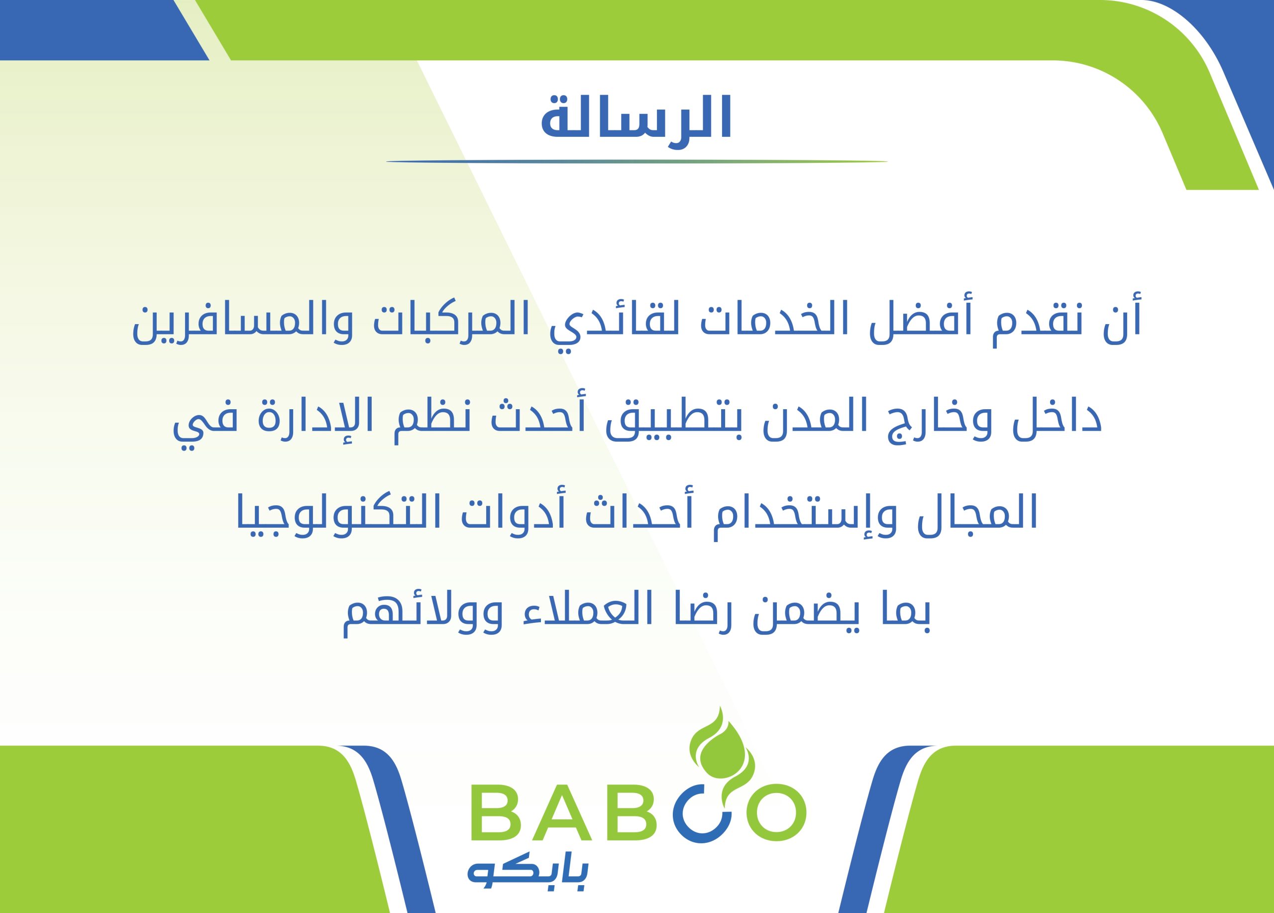 أن نقدم أفضل الخدمات لقائدي المركبات والمسافرين داخل وخارج المدن بتطبيق أحدث نظم الإدارة في المجال واستخدام أحدث أدوات التكنولوجيا بما يضمن رضا العملاء وولائهم