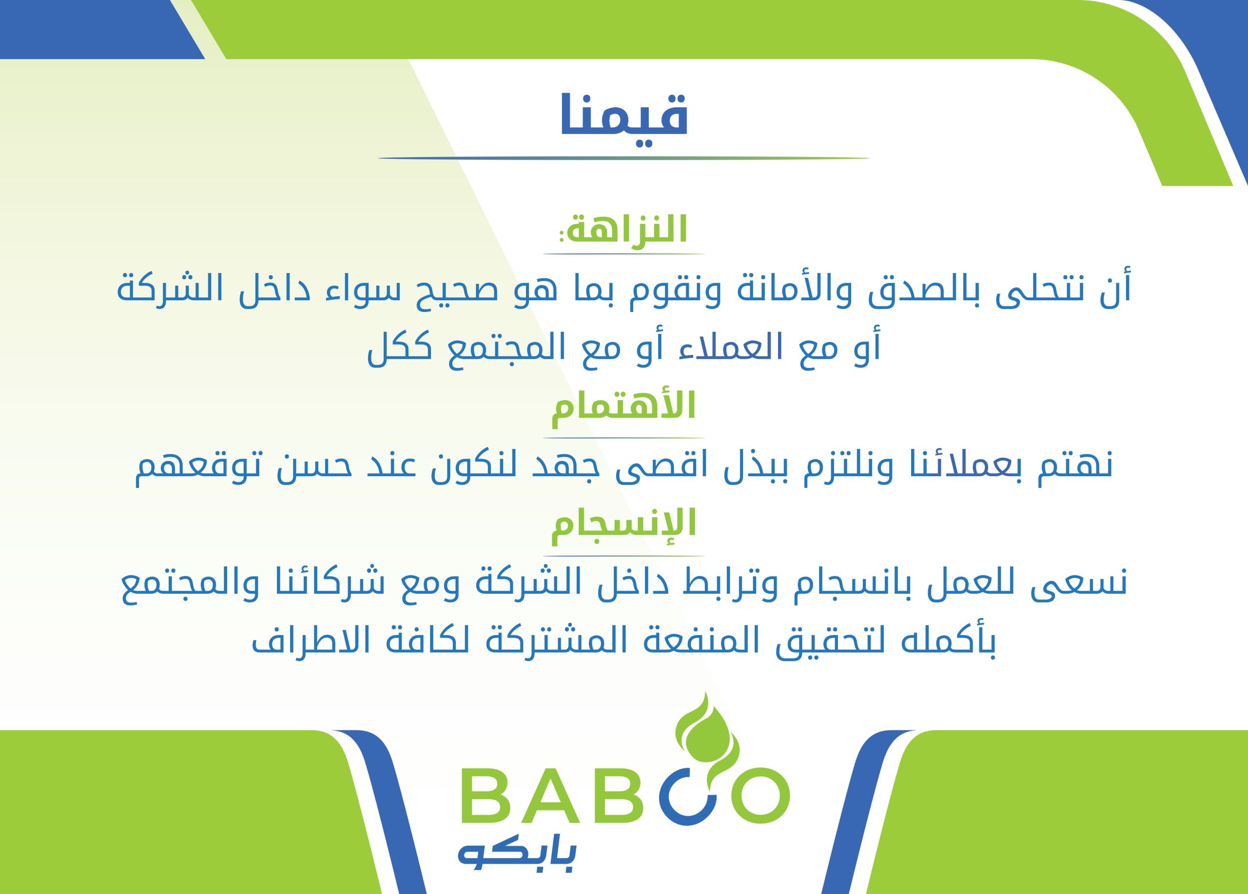 أن نتحلى بالصدق والأمانة ونقوم بما هو صحيح سواء داخل الشركة أو مع العملاء أو مع المجتمع ككل - الاهتمام: