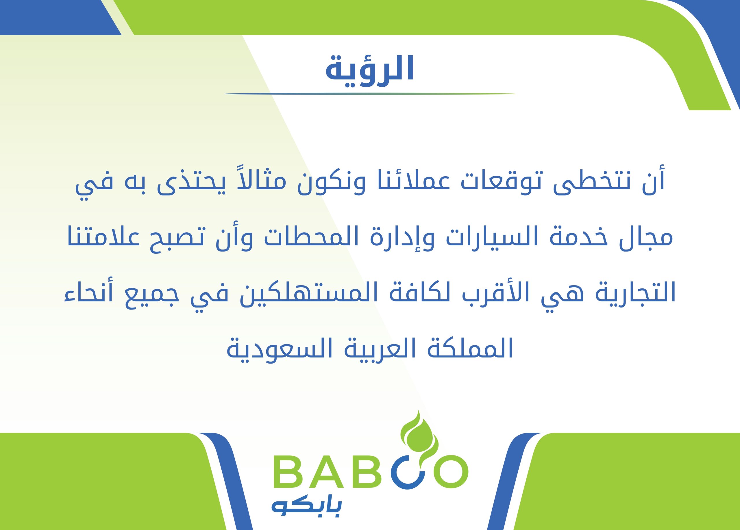 أن نتخطى توقعات عملائنا ونكون مثالاً يحتذى به في مجال خدمة السيارات وإدارة المحطات وأن تصبح علامتنا التجارية هي الأقرب لكافة المستهلكين في جميع أنحاء المملكة العربية السعودية